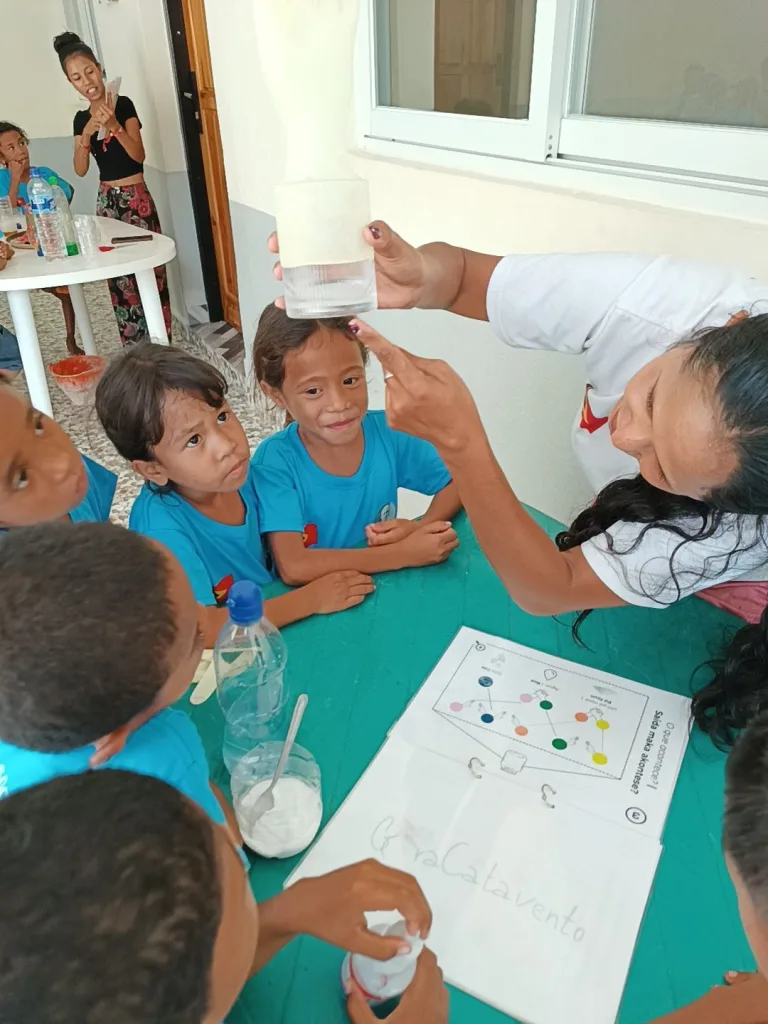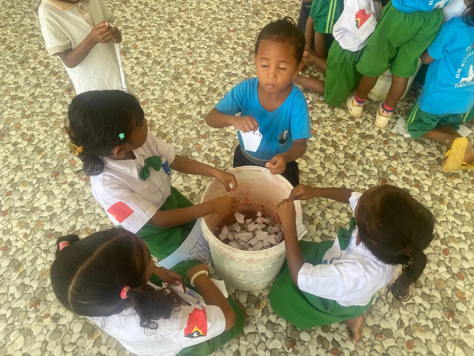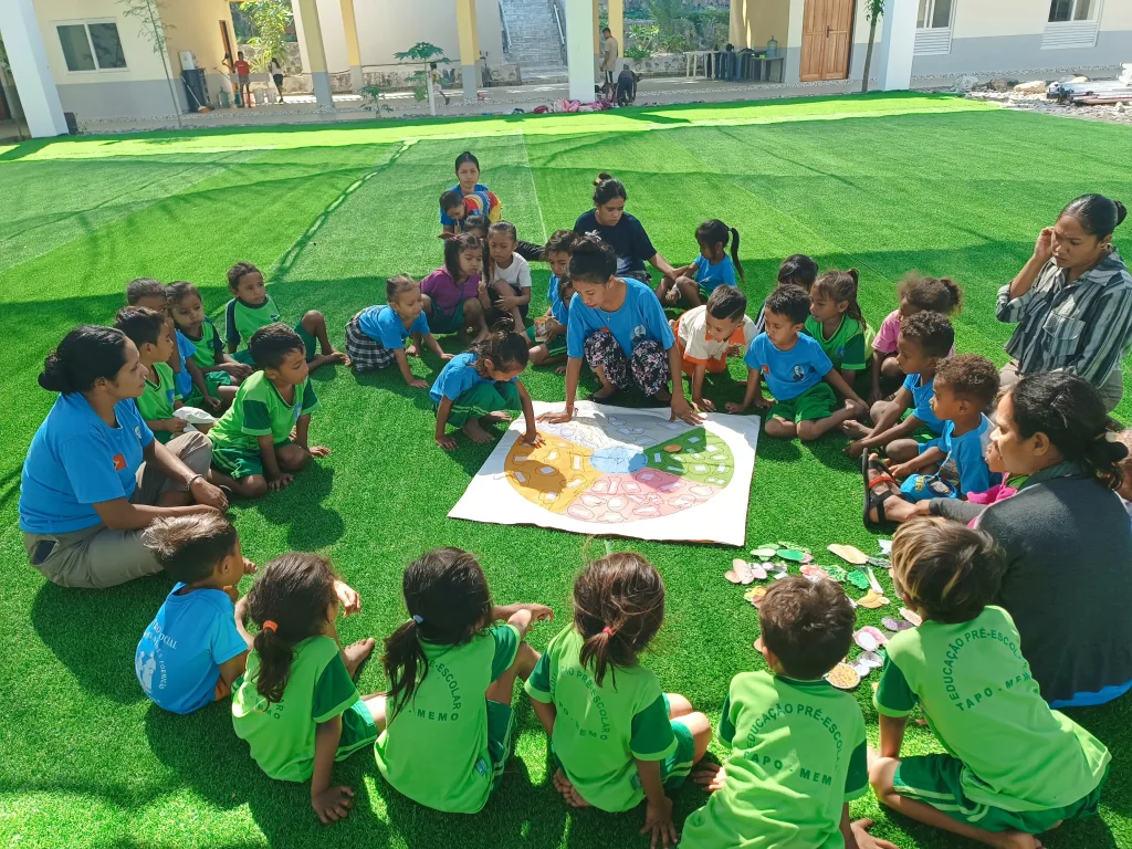 Já instaladas no Centro, as nossas fundadoras colocaram mãos à obra. Muito material foi levado de Portugal, devido aos recursos escassos, alguns mesmo indisponíveis, em Timor-Leste. Nós na GiraCatavento trabalhamos com a realidade que nos é apresentada e adaptamo-nos às questões que em Portugal podem ser mais banalizadas, mas que nestes contextos realmente se distinguem do status quo. Levaram rodas dos alimentos em tecido para os meninos aprenderem mais sobre alimentação equilibrada e variada; material para na semana da ciência fazerem experiências de química e física com as crianças; lupas para as crianças compreenderem conceitos de pequeno e grande, bem como, explorarem o mundo ao seu redor; testes de desenvolvimento cognitivo para percebermos melhor o panorama atual do desenvolvimento das competências das crianças e adaptarmos o nosso trabalho consoante as suas verdadeiras necessidades, e muitas coisas mais. O restante material utilizado em cada atividade foi sempre selecionado com vista à reutilização e reciclagem de material já existente: garrafas de água, cartão, … e até papel “velho” foi utilizado para fazer pasta de papel!